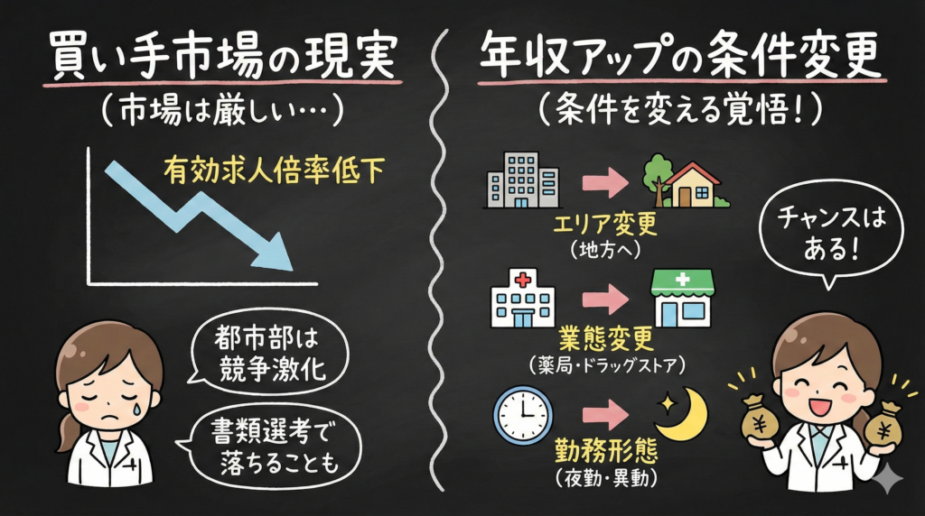 地方ではいまも薬剤師不足が続いていますし、在宅業務や服薬フォローに対応できる薬剤師の需要は高まっています。「市場全体が厳しい」と「あなたにとって選択肢がない」はイコールではありません。