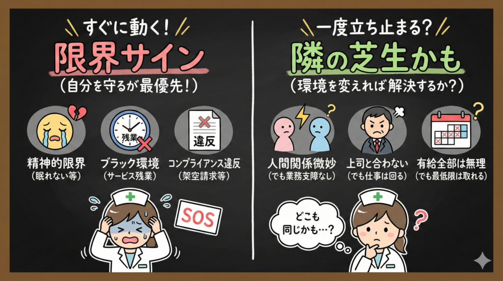 • 強い不満がある場合は、「環境を変えれば解決するか」を見極める。コンプライアンス違反や心身の限界がある場合は早めに動く