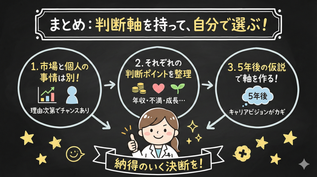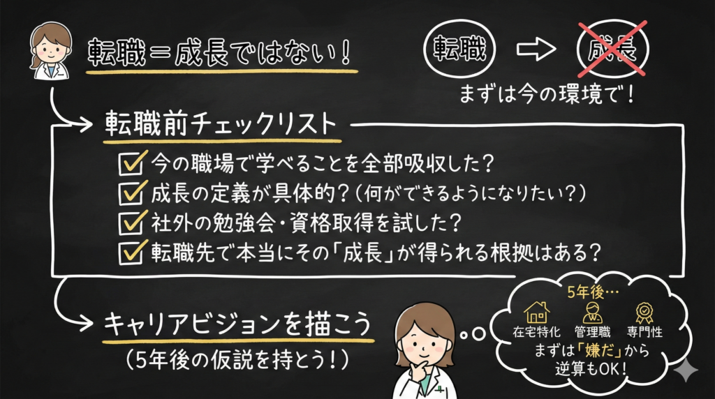 逆に言うと、成長の定義が明確で、今の職場では物理的にそれが得られない(在宅業務がない、がん専門の経験が積めない、など)場合は、転職が有効な選択肢になります。