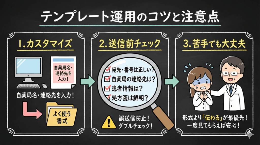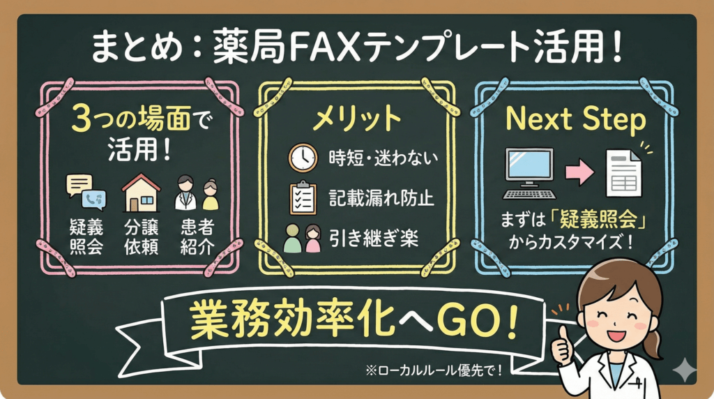 なお、今回紹介したテンプレートはあくまで一例です。医療機関や地域によってローカルルールがある場合は、そちらを優先してください。不明点があれば、各都道府県の薬剤師会や、取引先の医療機関に確認するのが確実です。