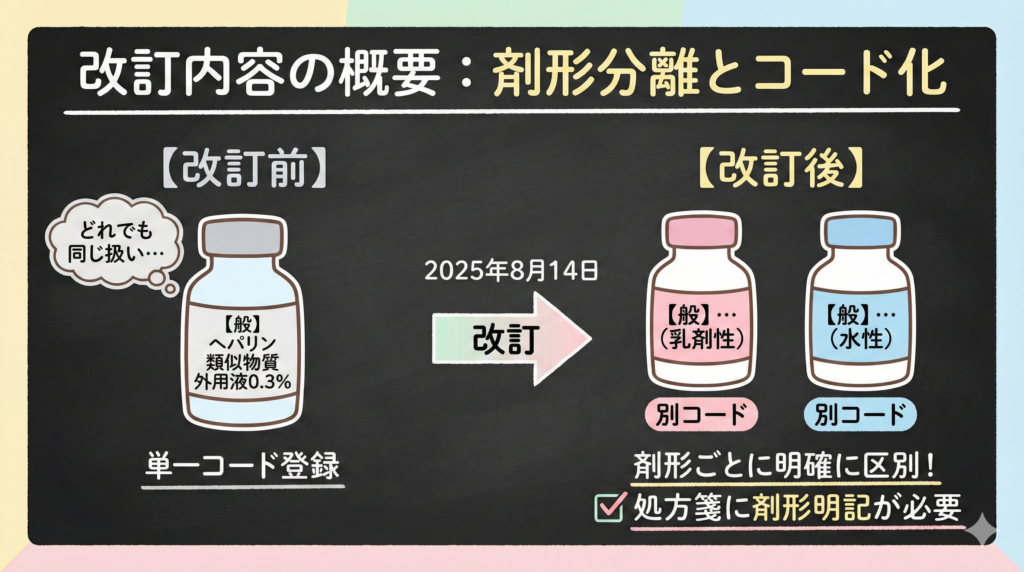 2025年8月14日より、ヘパリン類似物質外用液の一般名処方マスタが大幅に改訂されました。これまで単一コードで登録されていた「【般】ヘパリン類似物質外用液0.3%」が、「乳剤性」と「水性」の2つの剤形に分離され、それぞれ別コードで管理されることになります。
