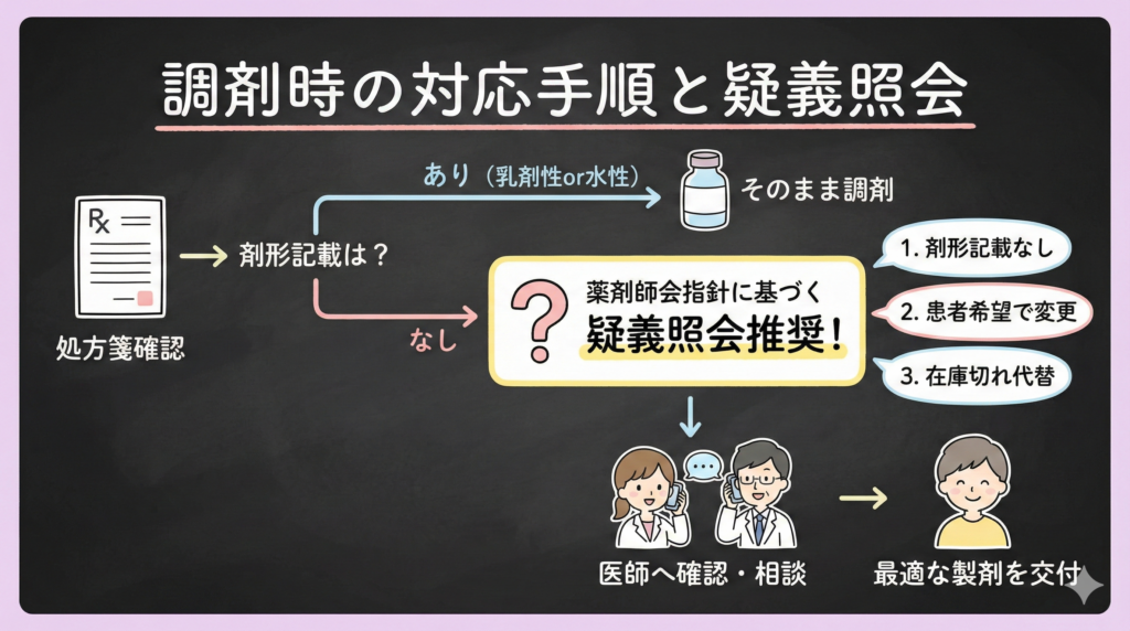 - 対応:疑義照会→医師指示により乳剤性または水性を選択