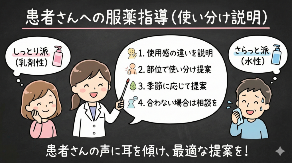 - 使用部位:顔・首(→乳剤性推奨)、体幹・四肢(→水性も選択肢)