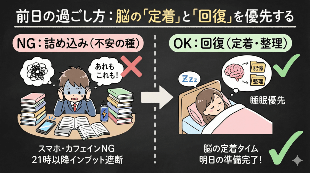 1. 前日の過ごし方:脳の「定着」と「回復」を優先する