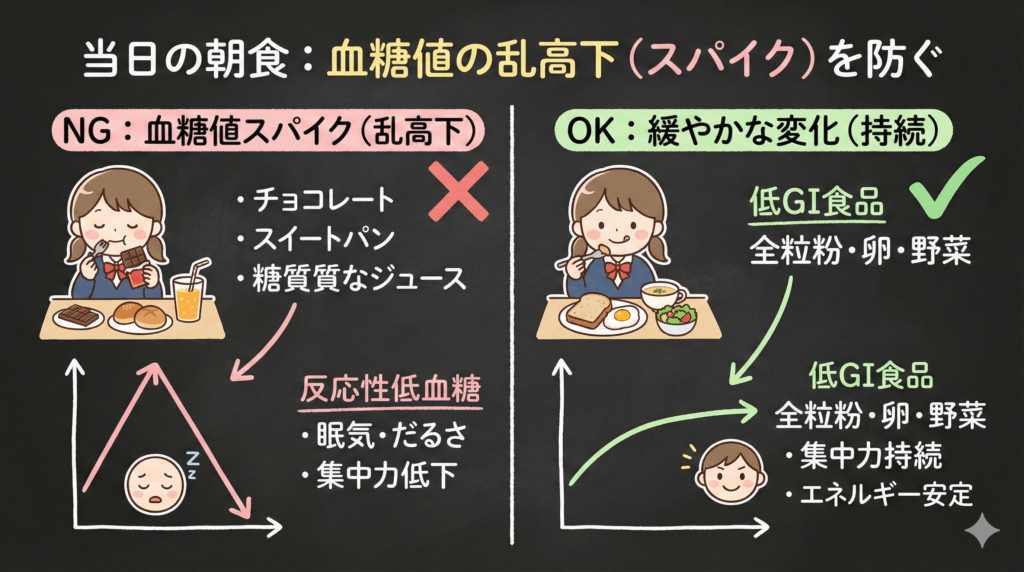 2. 当日の朝食:血糖値の乱高下(スパイク)を防ぐ