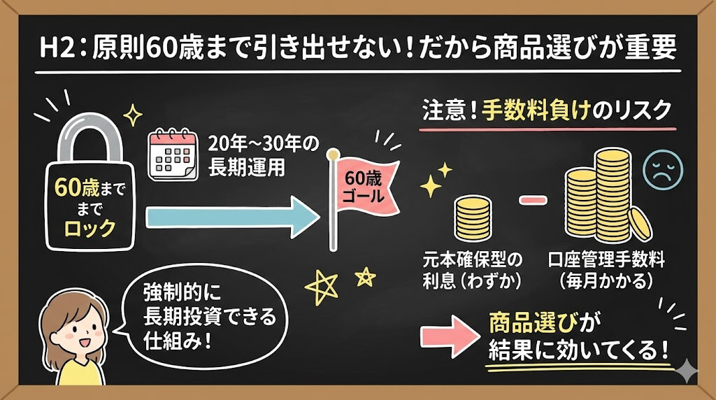 その気持ちは自然ですね。ただ「引き出せない=長期で運用できる」と読み替えると、見え方が変わってきます。短期の値動きに振り回されにくい環境が、制度側で用意されているということですから。