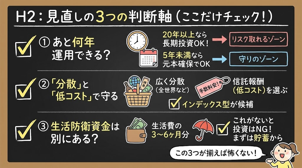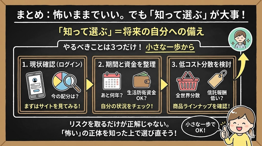 元本確保型が「ダメ」なのではありません。受け取り時期が近い人、すでに別口座で十分にリスクを取っている人、精神的にどうしても値動きに耐えられない人にとっては、合理的な選択です。