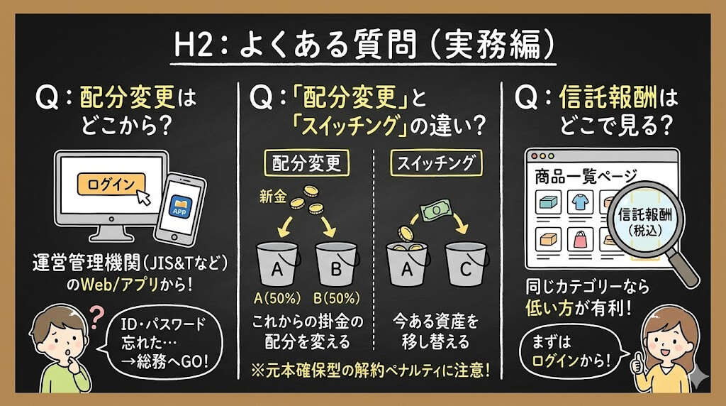 お勤め先のDC運営管理機関(レコードキーパー)のWebサイトやアプリからログインして変更できます。JIS&T、NRK(日本レコード・キーピング・ネットワーク)、SBIベネフィット・システムズなどが主な運営管理機関です。ログインIDやパスワードがわからない場合は、総務・人事部門に聞くのが最短ルートです。
