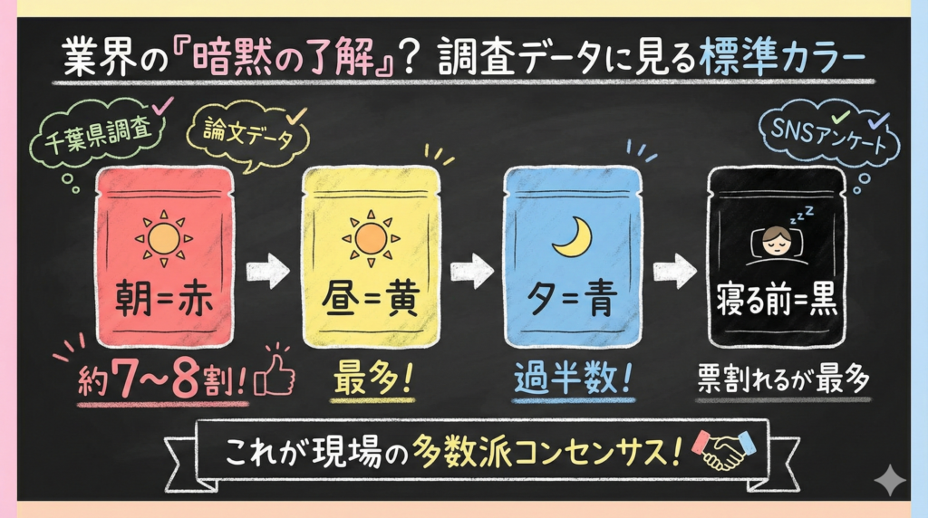 論文などの硬いデータだけでなく、こうしたSNS上の「現場のコンセンサス」からも、「朝赤・昼黄・夕青・眠前黒」が、地域や世代を超えた事実上の標準(デファクトスタンダード)であることが裏付けられています。