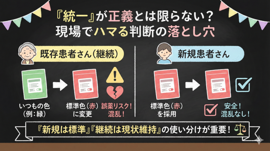 その通りです。だからこそ、『新規なら標準カラー』『継続なら現状維持』という使い分け(ダブルスタンダード)が必要になるんです。ここを柔軟にやらないと、クレームや誤薬に直結しますよ