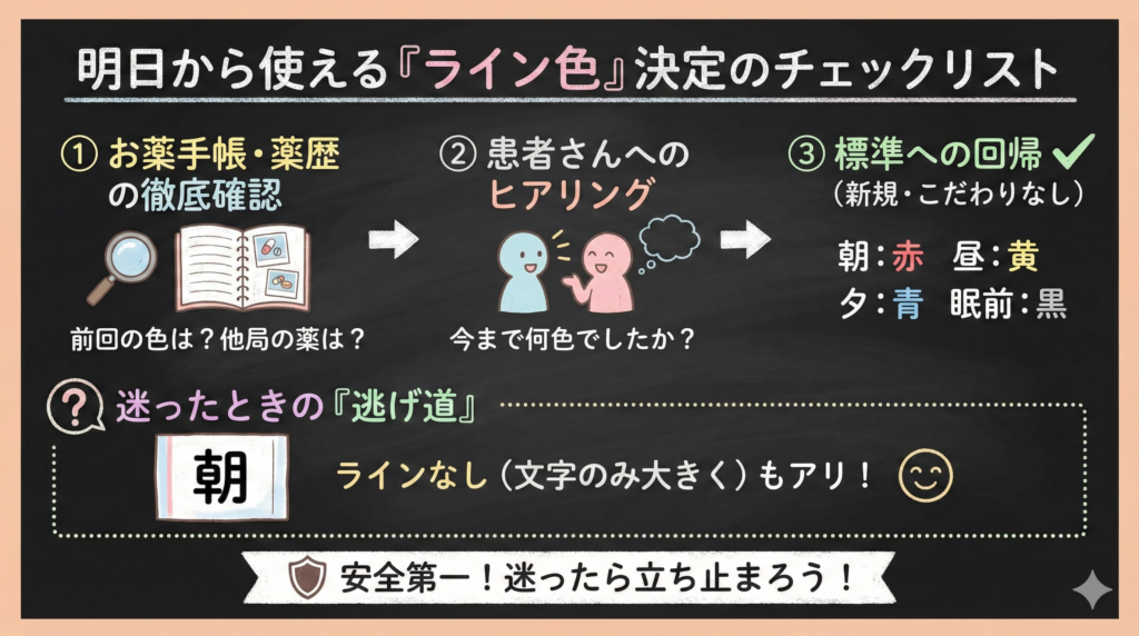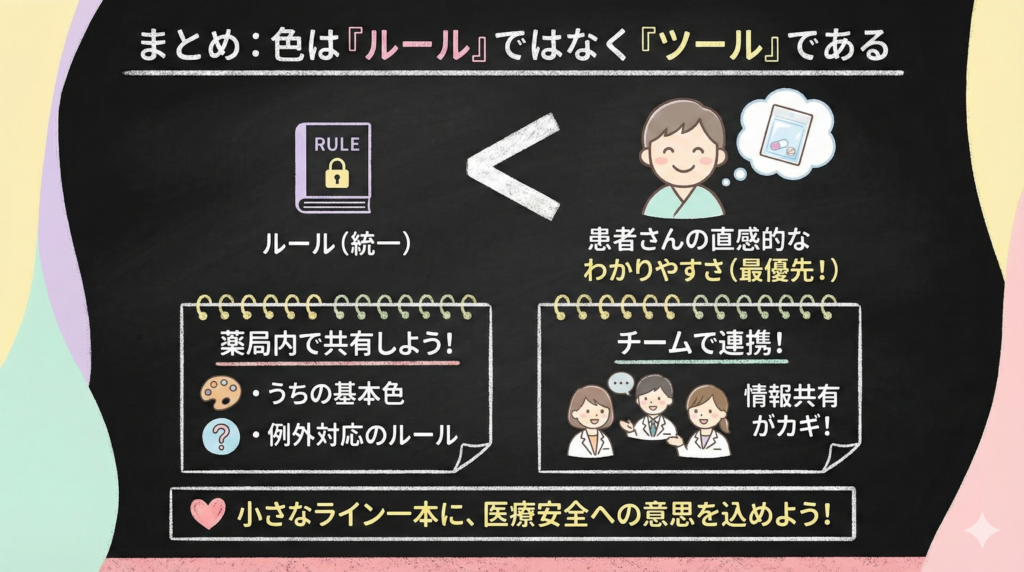 もし、あなたの薬局で色のルールが曖昧になっているなら、一度スタッフ全員で「うちの基本色」と「例外対応」について話し合ってみませんか?