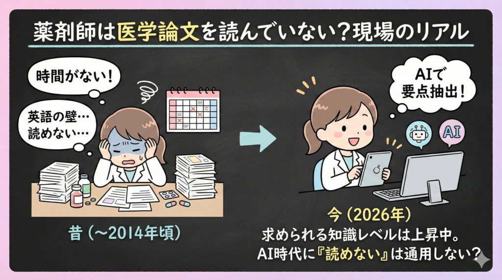 かつての調査(2014年)では、多くの薬剤師が「論文を読む必要がある」と感じつつも、「時間がない」「語学の壁」を理由に読めていないというデータがありました。