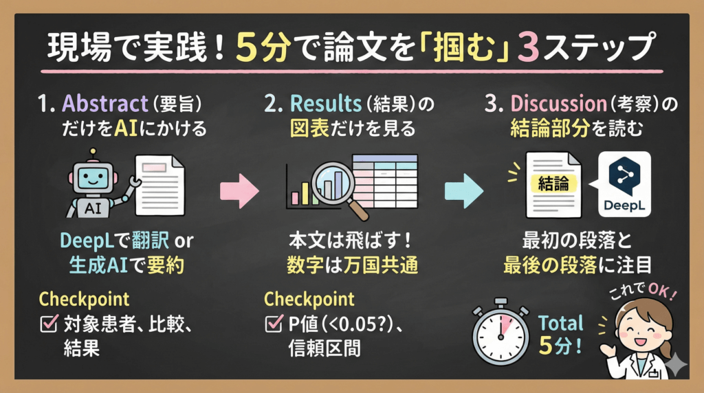 - 忙しい現場で「5分」で論文の要点を掴む3ステップ
