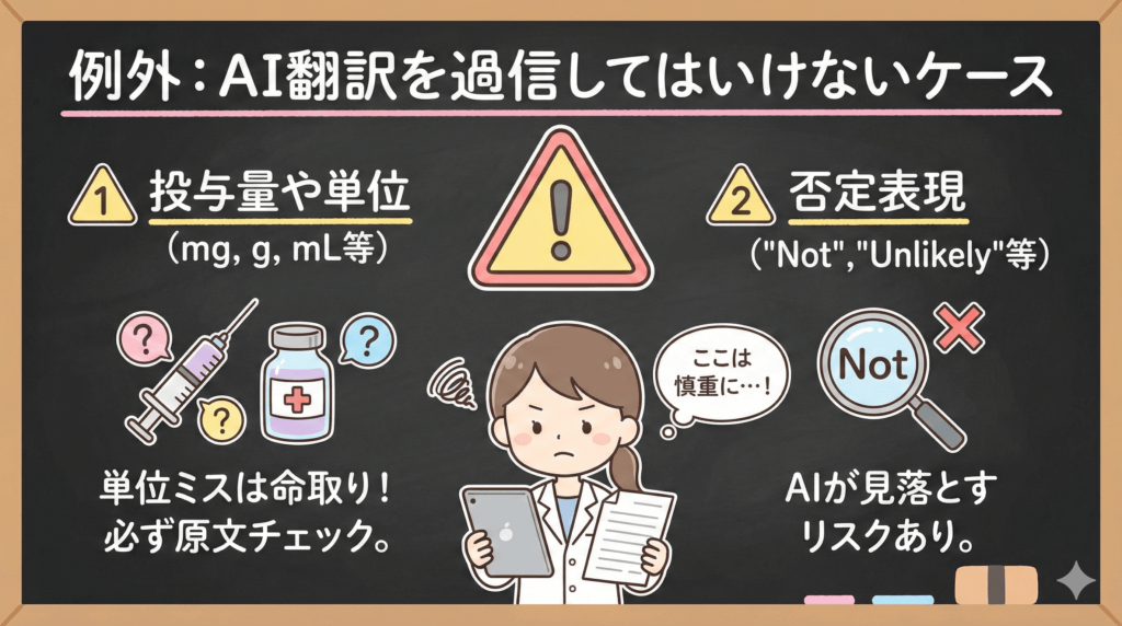- 投与量や単位: mg, g, mLなどの単位ミスは命取りです。必ず原文チェック。