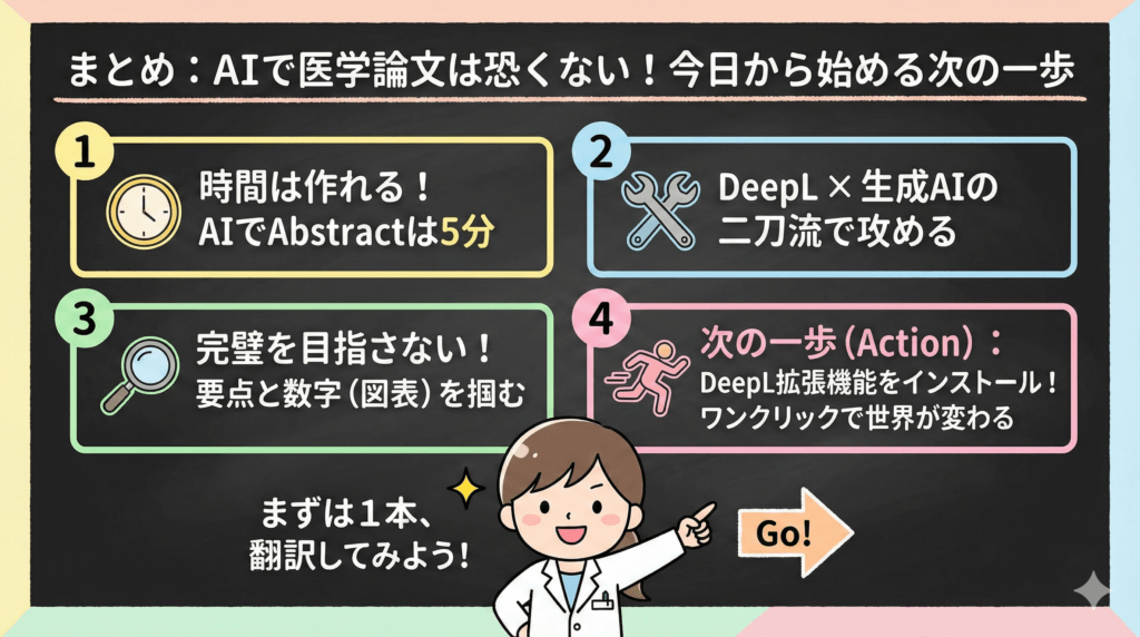 - 完璧を目指さない: 全文翻訳は不要。Abstractと図表(数字)だけ確認すれば、臨床での活用度は格段に上がります。