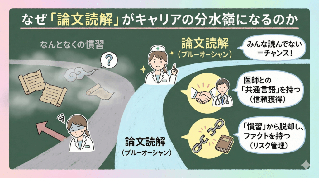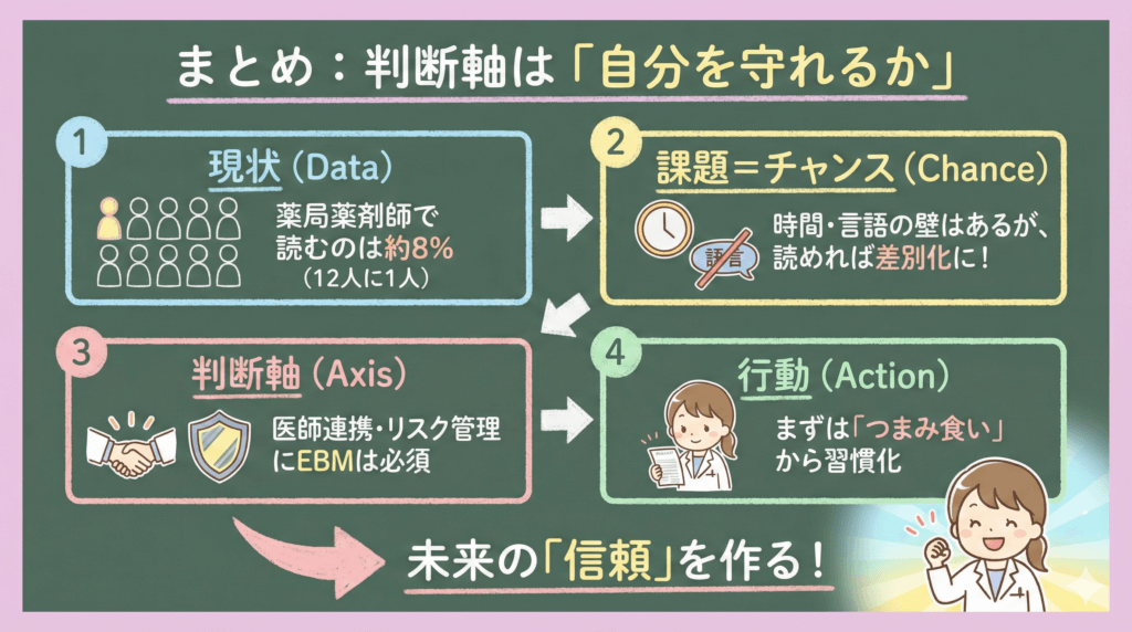 - 判断軸: 医師との対等な連携やリスク管理のため、EBMスキルは必須になりつつある。