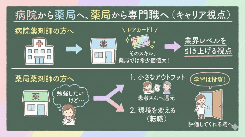 「病院より給料が良いから」という理由だけで転職するのも一つですが、「あなたの当たり前が、薬局業界のレベルを引き上げる」という視点でキャリアを選ぶと、待遇交渉でも強気に出られます。