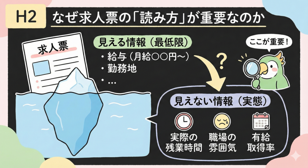 書かれている内容は正確ですが、「書かれていないこと」も多いんです。たとえば、実際の残業時間や有給取得率、職場の雰囲気などは求人票からは読み取れません。ここ、迷いやすいところです。