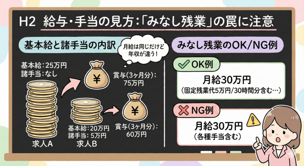 私もかつて、「年収500万円」という数字だけに惹かれて応募し、入職後に「基本給に30時間分のみなし残業が含まれている」と知ってショックを受けた経験があります。賞与も思ったより低く、年収換算すると前職とほぼ変わらなかったんです。