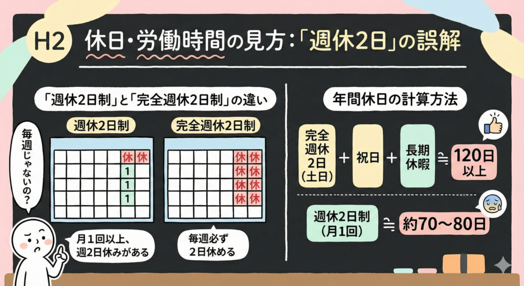 - 休日:週休2日制 or 完全週休2日制、年間休日数、変形労働時間制の有無