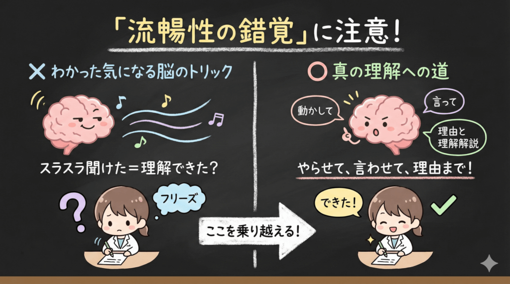 そう、それが普通なんです。認知心理学では「流暢性の錯覚(fluency illusion)」と呼ばれる現象があります。スラスラ聞けた・読めた=理解できた、と脳が誤認してしまうんですね