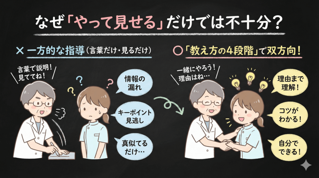 新人指導でよくあるパターンは、「言葉で説明する」か「やって見せる」のどちらか、あるいは両方です。これ、指導者側としては「教えた」という実感が持てますよね。