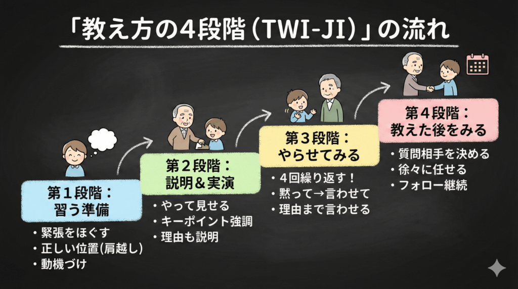 実は、指導法には体系化された方法論があります。それがTWI-JI(Training Within Industry – Job Instruction)と呼ばれる「教え方の4段階」です。第二次世界大戦時にアメリカで開発され、日本の製造業でも長く活用されてきた手法ですが、医療現場でも十分に応用できます。