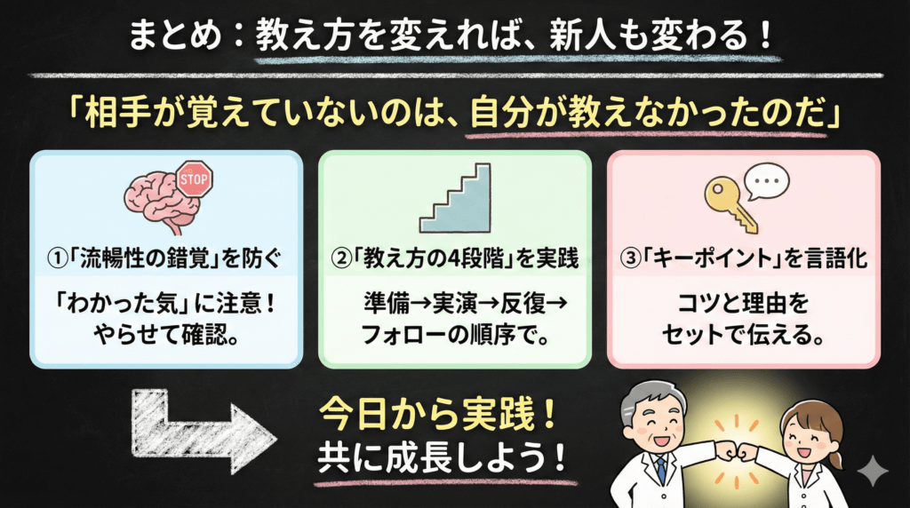 もちろん、この方法を使えばどんな新人でも必ずできるようになる、とまでは言い切れません。相性や新人側の事情もあります。ただ、「何度言えばわかるんだ」という言葉が出てきそうになったら、一度立ち止まって、自分の教え方を振り返るきっかけにしてもらえればと思います。