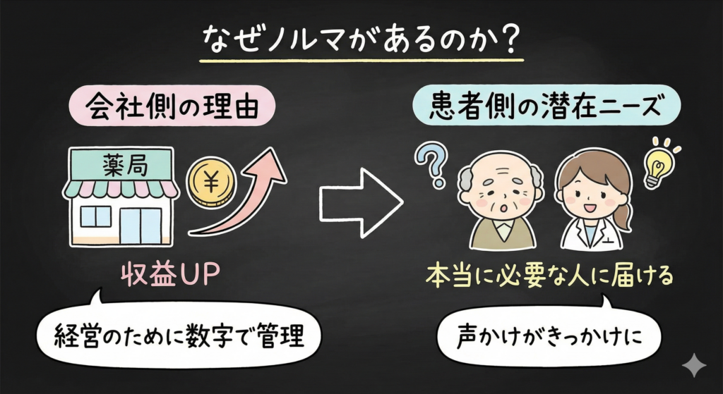 私ならまず、「ノルマ=悪」と決めつけず、患者さんのニーズを掘り起こす手段として機能しているかどうかで判断します。ただし、ここで注意したいのは「数字の妥当性」と「達成できないときの扱い」です。来局患者の50%を取れ、なんて目標は現実的ではありません。