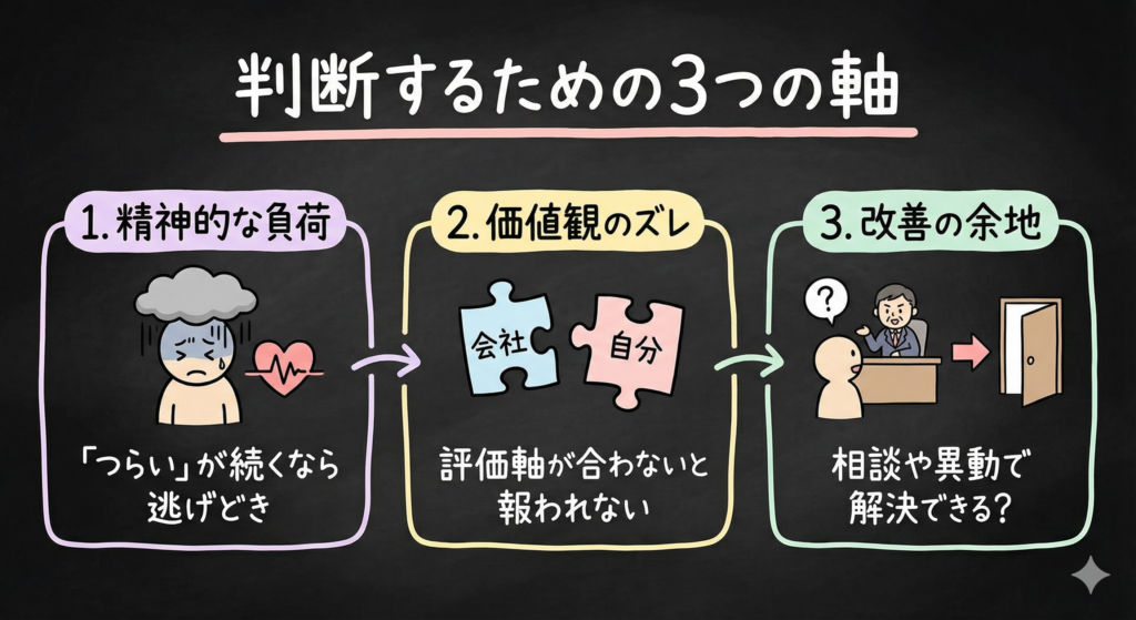 だからこそ、「自分はどこまで許容できるか」「この会社の評価軸と自分は合っているか」を言語化しておくことが大事です。