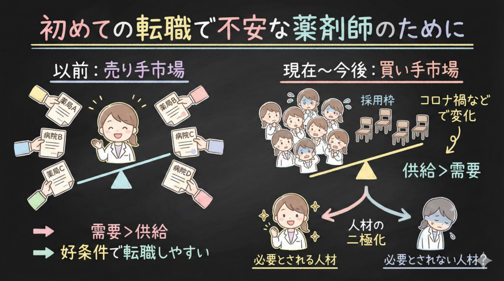 今まで薬剤師の業界は売り手市場だったので、何も考えず、好条件の転職ができました。