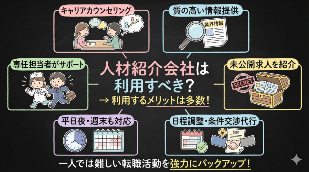 忙しくても効率よく進めたい/まず候補を短時間で作りたい人向け。 非公開求人や条件交渉、裏側情報の確認まで“スピード×実務代行”で進めやすいのが特徴です。