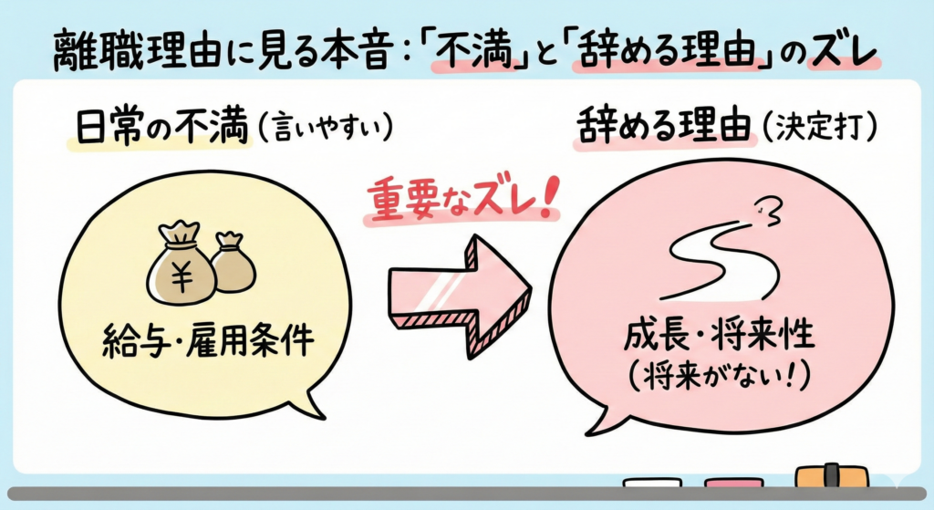 この「不満として語られること」と「実際に辞める理由」のズレは、次のような判断プロセスを示しています: