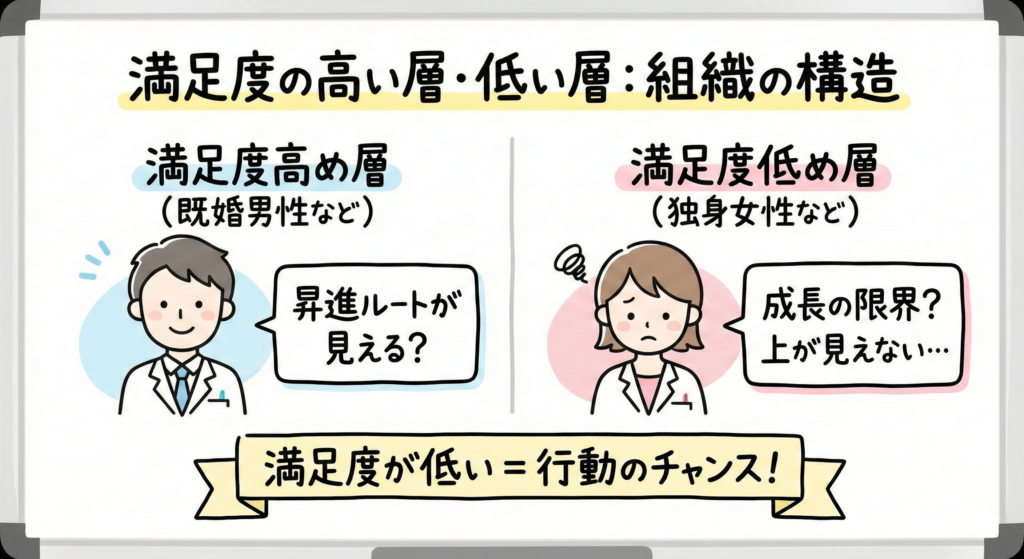 注意したいのは、この「満足度の低さ」が必ずしも悪いわけではないという点です。満足度が低いからこそ、現状を変えようと動き出す。転職や学び直しを検討し始める。むしろ、漠然とした不満を感じているのに何も行動しない方が、長期的にはリスクが高いと私は考えています。