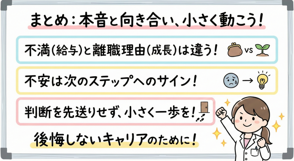 これらを試してみて、「今の会社でもまだやれることがある」と感じるなら、転職を急ぐ必要はありません。逆に「やっぱり環境を変えないと無理だ」と確信が持てるなら、それが次に動くタイミングです。