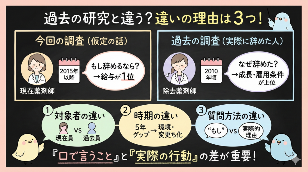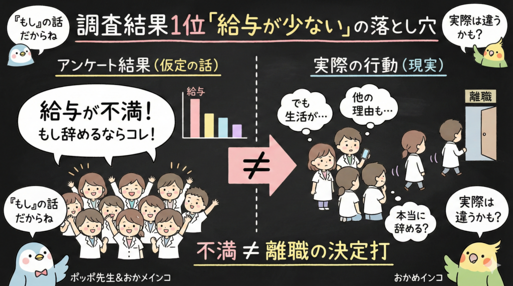 現在働いている人に「もし辞めるなら」と聞くのと、実際に辞めた人に「なぜ辞めたか」と聞くのでは、回答が変わるのは自然です。現場だとここで詰まりがちですが、「今の不満」と「辞めた理由」は別物と考えたほうが安全です。