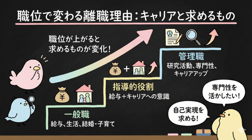 この調査では、職位による離職理由の違いも明らかになりました。特に注目すべきは、管理職や指導的役割の薬剤師ほど「研究活動への理解不足」を離職理由に挙げる傾向があったことです。