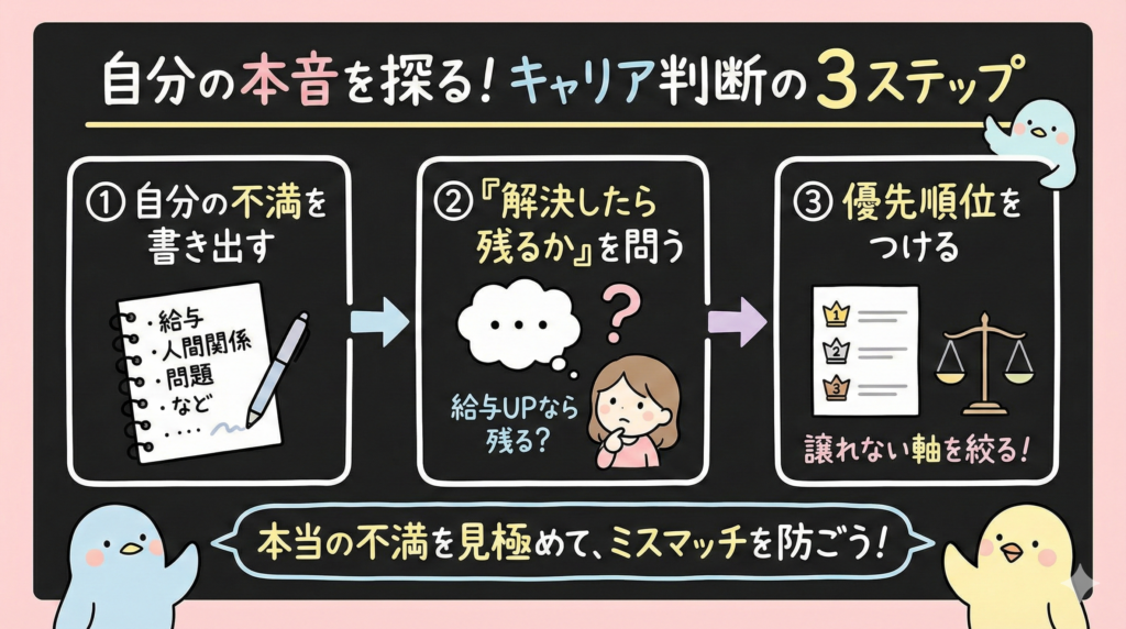 ただし、生活に直結する問題(給与が低すぎて生活が成り立たない、過労で健康を害している)がある場合は、それを最優先にすべきです。安全性が確保されていない状態でのキャリア選択は危険です。