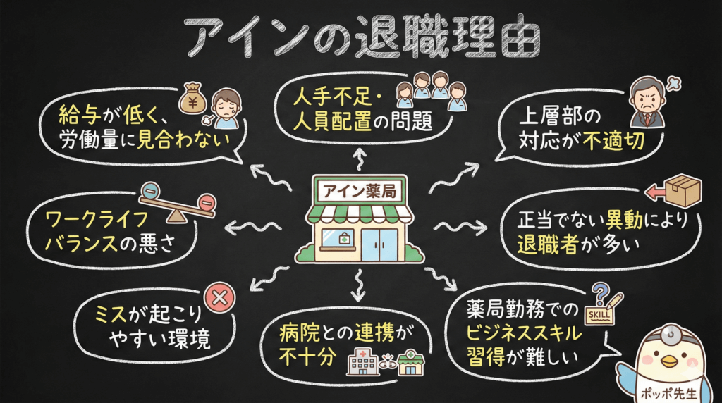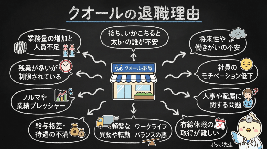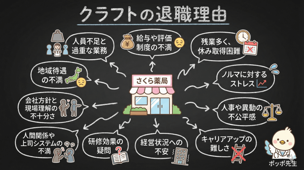 アイン、クオール、クラフトは業務多忙や給与の低さを理由に挙げている人が多い印象でした。