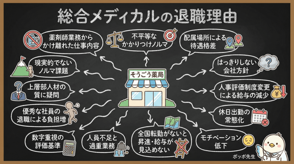 大手チェーン薬局として最後に総合メディカルの退職理由をまとめたものが以下に示します。