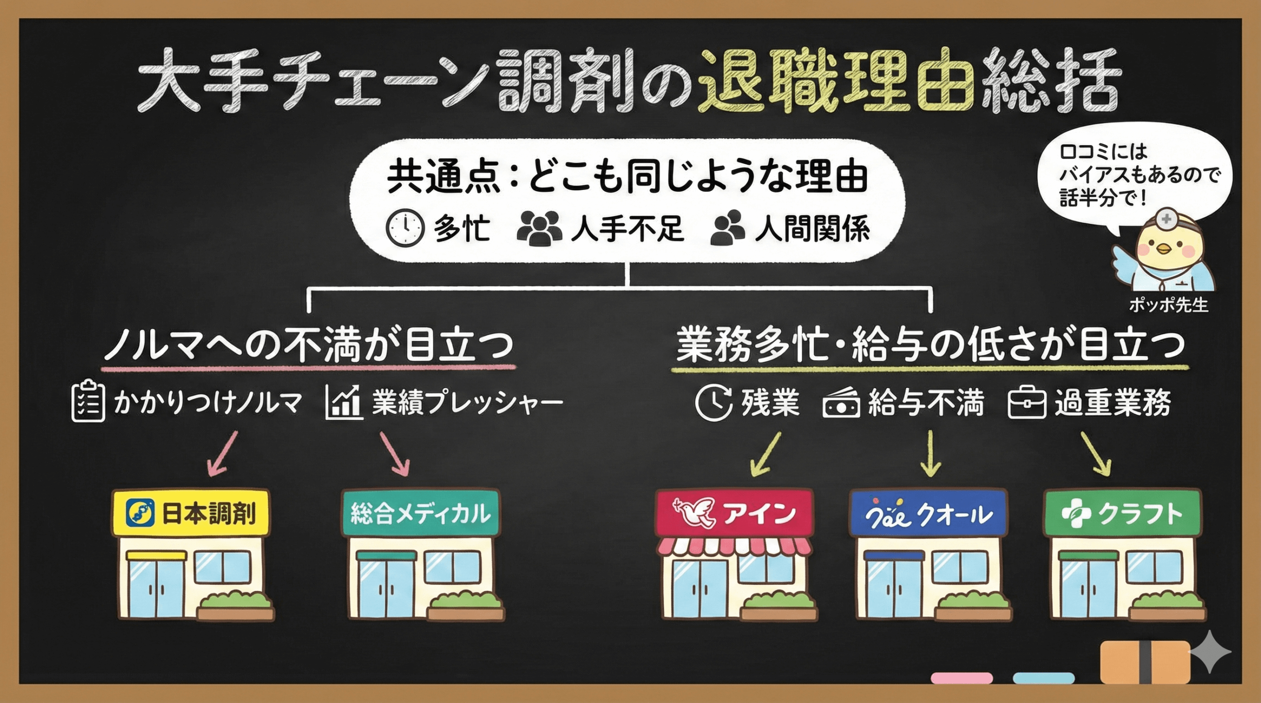 日本調剤、アイン、クオール、クラフト、総合メディカルと日本の大手調剤チェーン薬局を辞めた薬剤師の退職理由を口コミサイト等の情報からまとめてみました。