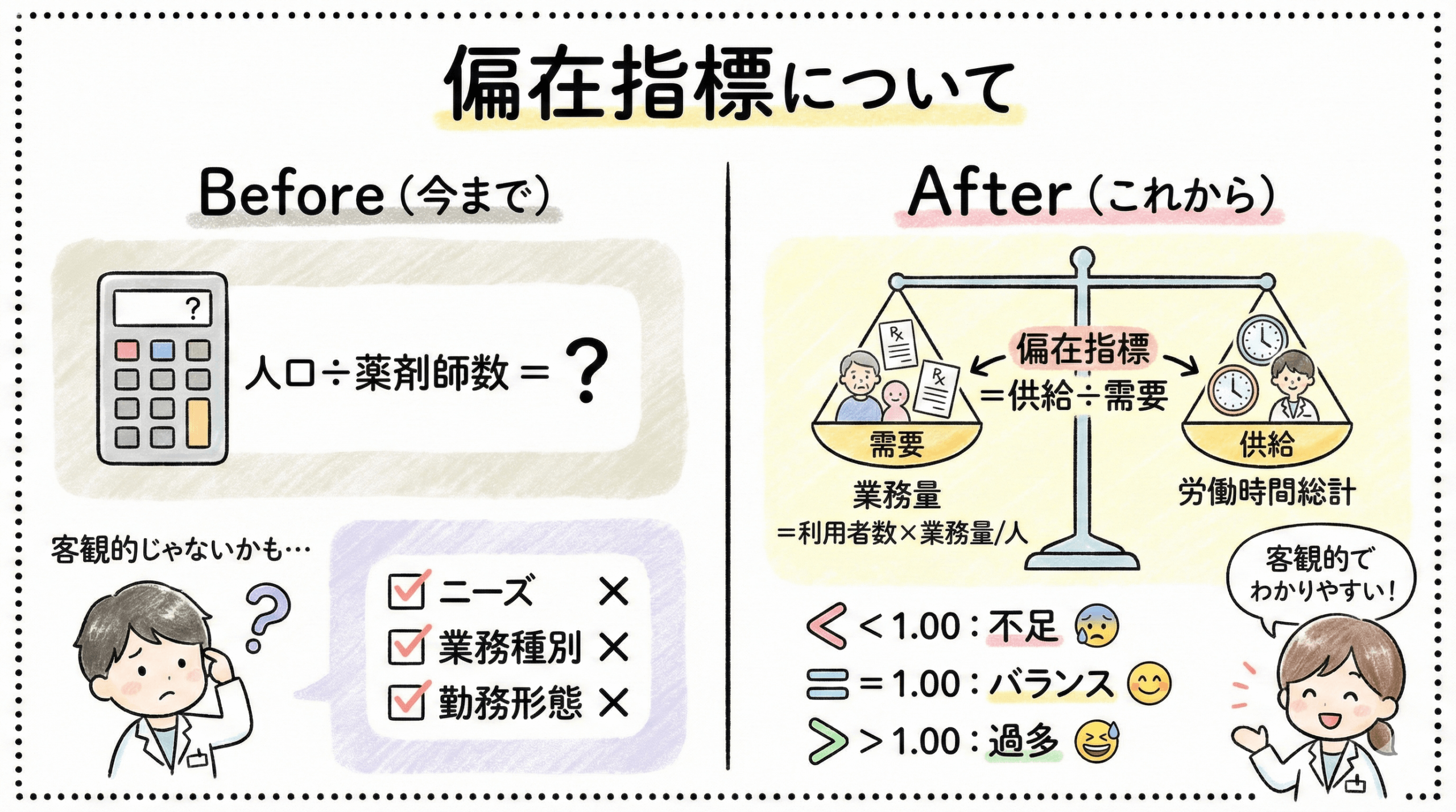 今までは薬剤師の地域偏在の指標として、は人口10万人対薬剤師数が一般的に用いられてきたが、 医療需要(ニーズ)、 薬剤師の業務の種別(病院、薬局)、 薬剤師の性別、年齢、勤務形態などが考慮されていなかったため、客観的な指標としては不十分でした。