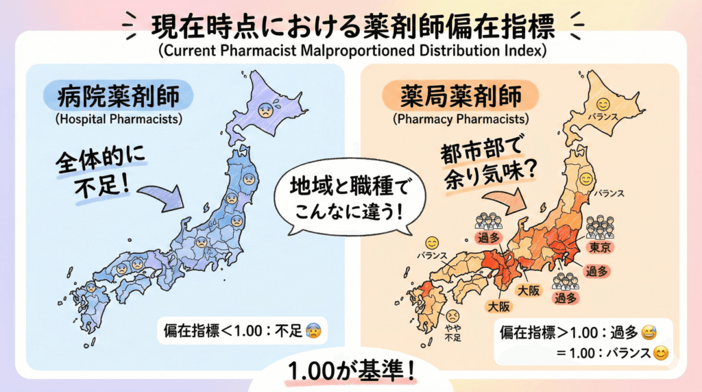 一方、病院薬剤師は、偏在指標1.00未満のところがほとんどです。