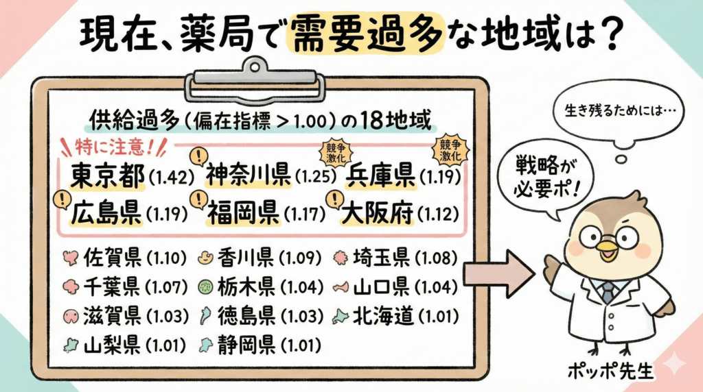 現在の偏在指標を見ると、病院薬剤師で1.00を超えている(供給過多)地域はありません。一方、薬局では以下の18の地域で偏在指標1.00超(供給過多)になっています。