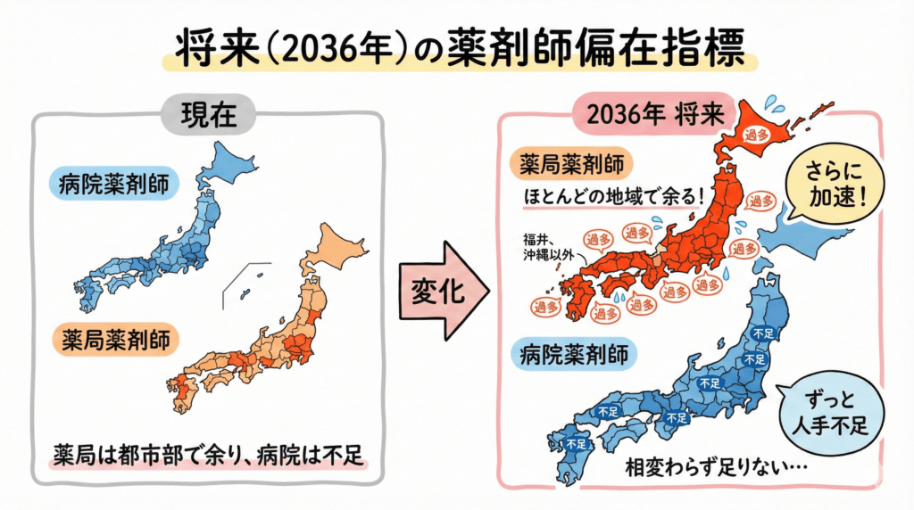 将来的に見ると、薬局薬剤師はほとんどの地域(福井、沖縄以外)で供給過多になることが予測されています。