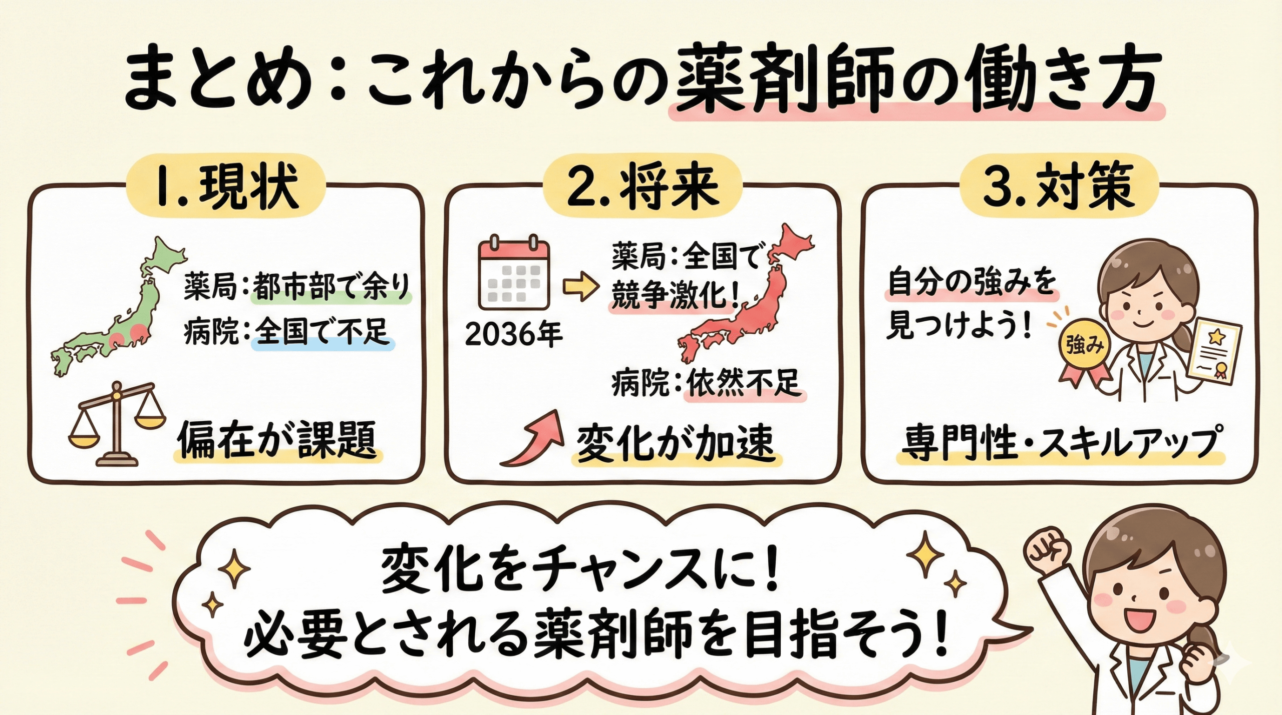 薬局薬剤師は、今後多くの地域で薬剤師余りになることが予想されるので、早い段階で自分の強みを見つけて、薬剤師過剰時代でも必要とされる薬剤師を目指していただければ幸いです。