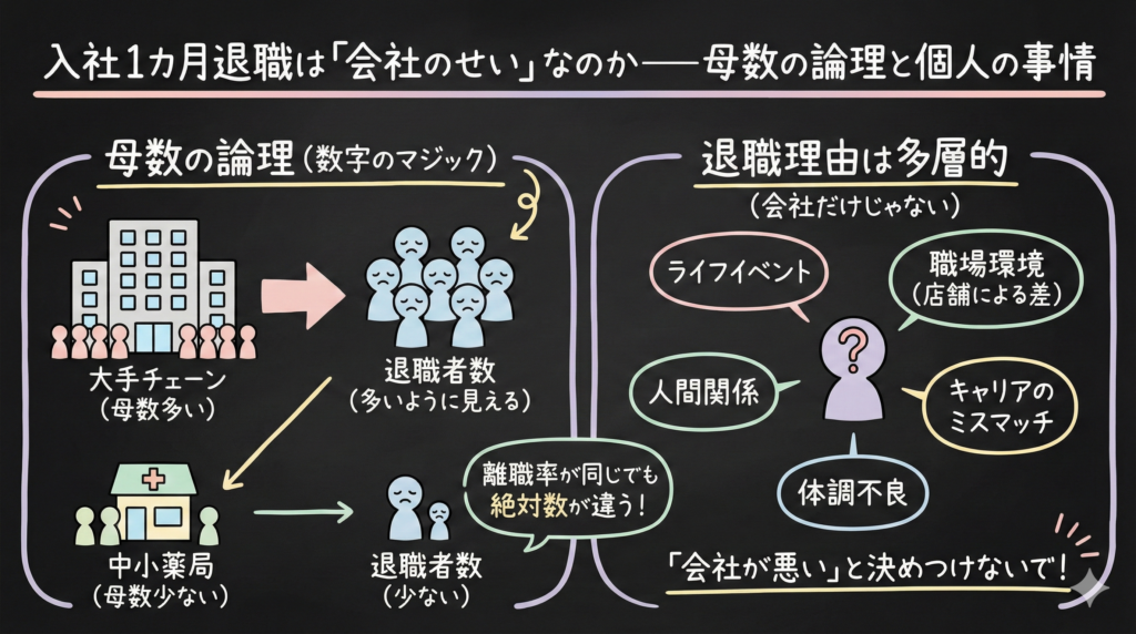 入社1カ月で辞める新人薬剤師について、結論から言えば「大手チェーンだから」という単純な理由ではないと私は考えています。母数が多ければ早期退職者の絶対数も増えるのは統計的に自然ですし、退職の背景には個人の事情、ミスマッチの構造、職場環境の問題が複雑に絡み合っています。