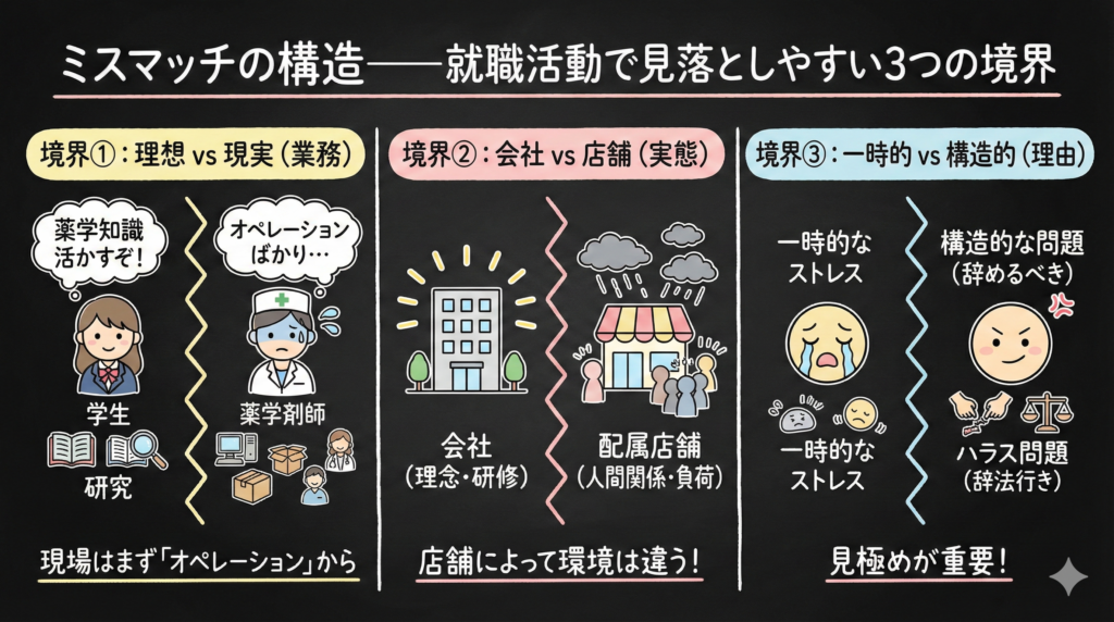 新卒採用のミスマッチ要因として、企業研究や自己分析の不足が指摘されています。特に薬局の場合、「会社」を見て入社しても、実際に働くのは「店舗」です。