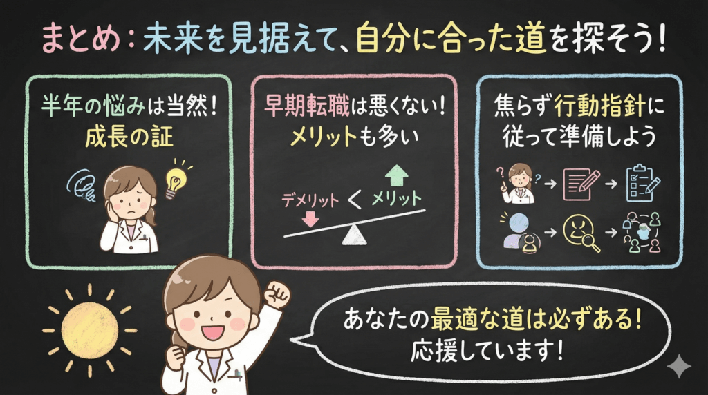 そして、「こんなに早く辞めてしまって大丈夫なの?」という不安も、あなたが思いやりと責任感を持っている証拠です。それは、素晴らしい薬剤師になるための大事な要素なので安心してください。