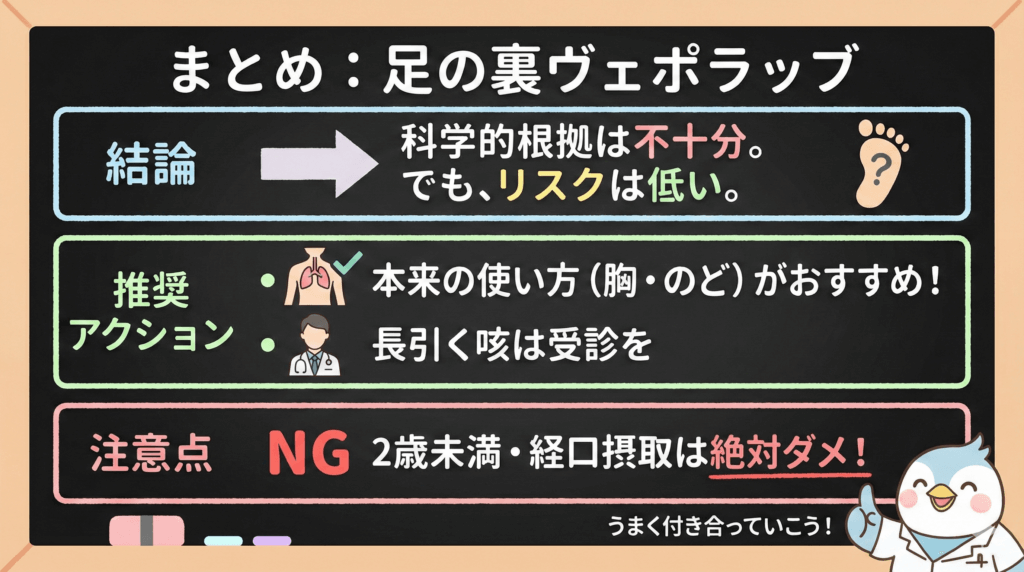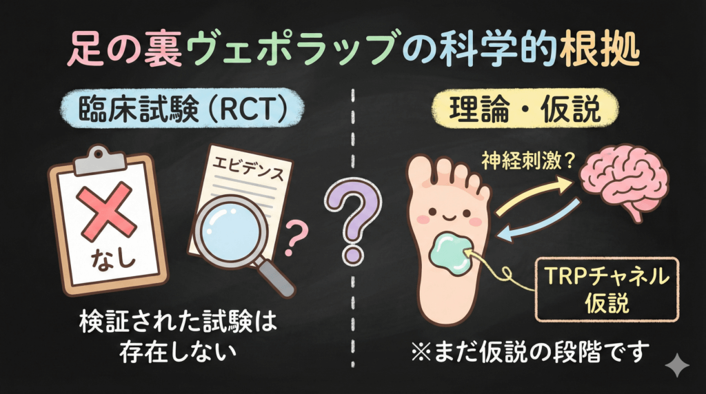 足の裏にヴェポラッブを塗る方法は、科学的根拠が不十分です。RCTはなく、理論的にも「あり得る」レベルにとどまります。一方で、健康被害のリスクは低いと考えられます。